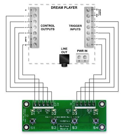 The PRICOM Button Board is a simple and easy to understand circuit of buttons and LED's. All connections are made using the on-board screw type terminal strips and are labeled to match the equivalent labels on The Dream Players. Simply match up the terminal positions of the Button Board with those of your Dream Player (as seen in the illustration below) and you're ready to go!